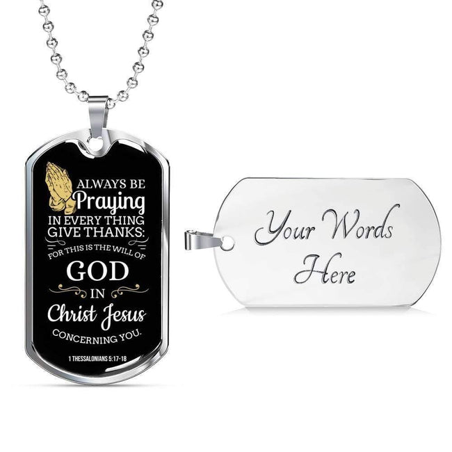 Always Be Praying Bible Verse Necklace Stainless Steel or 18k Gold Dog Tag 24" Chain