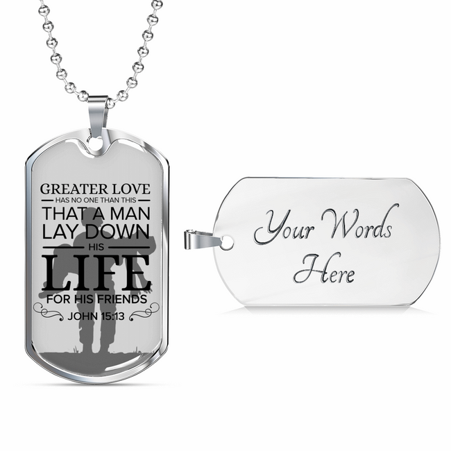 No Greater Love Soldier John 15:13 Verse Necklace Stainless Steel or 18k Gold Dog Tag 24"