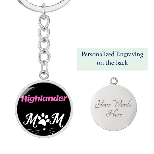 Highlander Cat Mom Keychain Stainless Steel or 18k Gold Circle Pendant