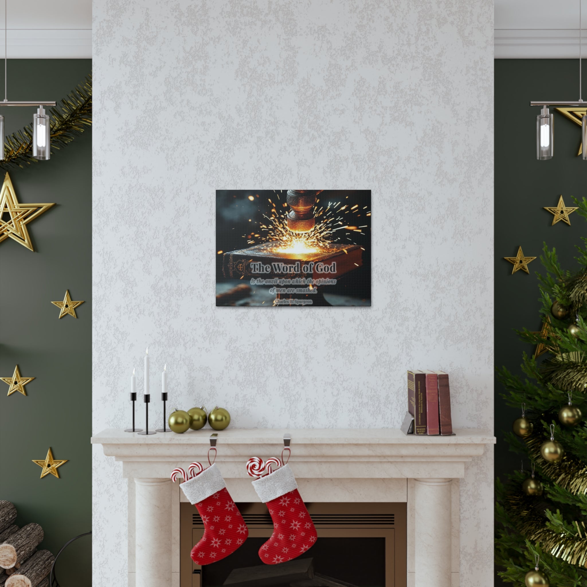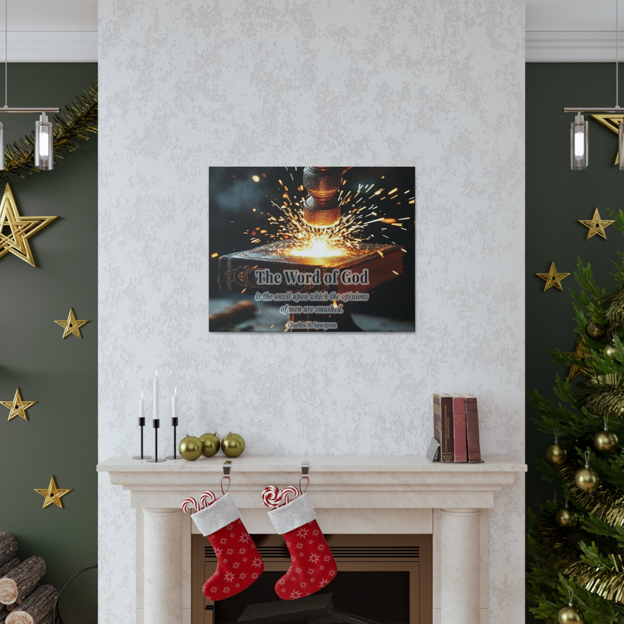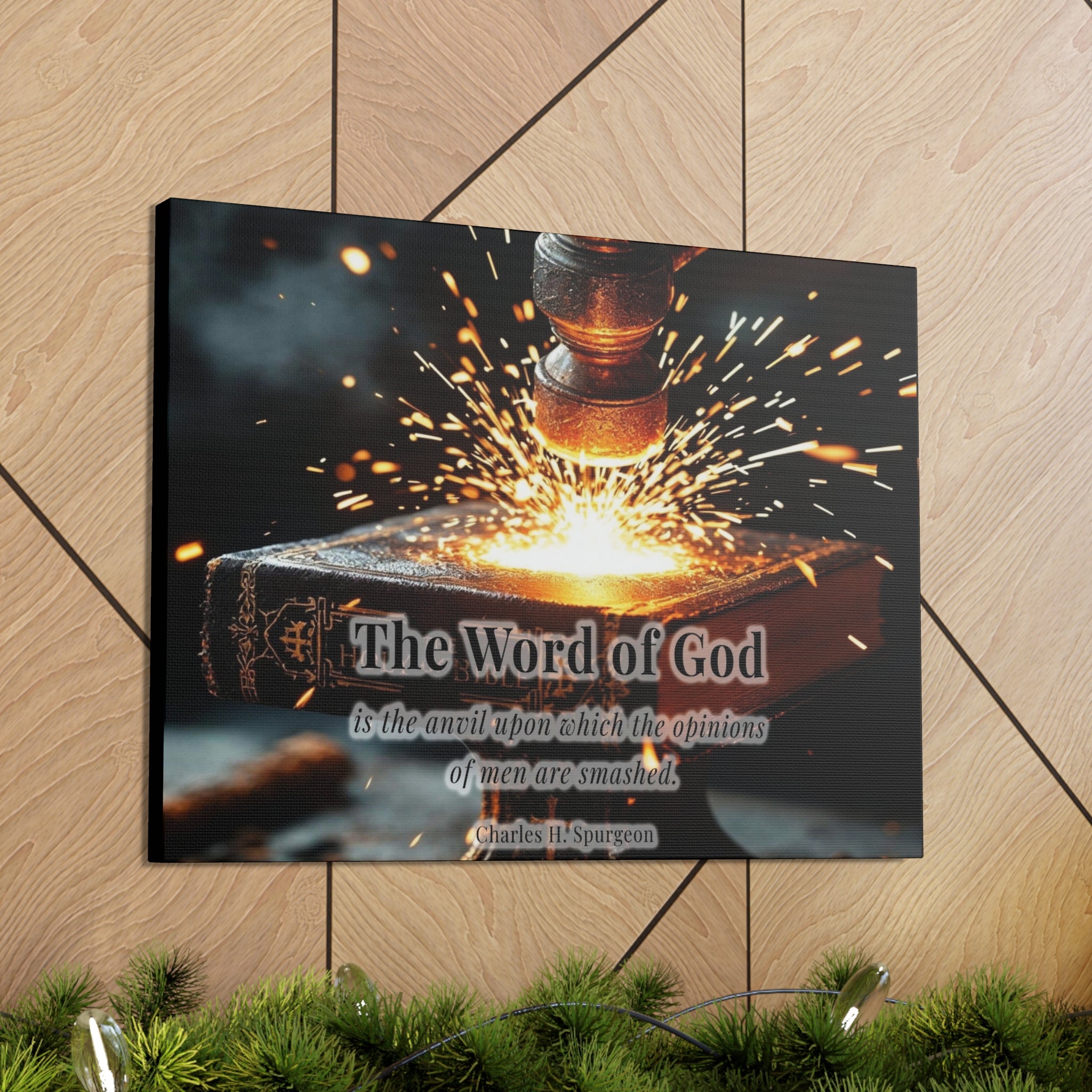 Inspire your space with the powerful wisdom of Charles H. Spurgeon through this striking Christian wall art. Featuring the quote, “The Word of God is the anvil upon which the opinions of men are smashed,” this canvas symbolizes faith, strength, and the unshakable truth of Scripture. The visually compelling design, with a glowing forge hammer striking against an anvil of faith, serves as a bold reminder of the enduring power of God’s Word.