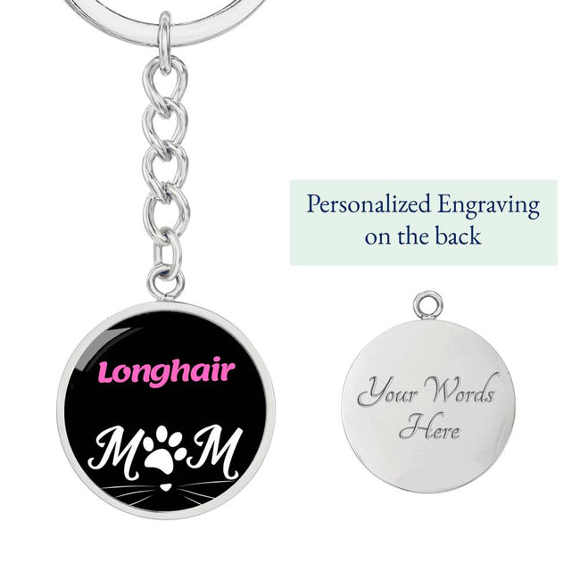 Longhair Cat Mom Keychain Stainless Steel or 18k Gold Circle Pendant