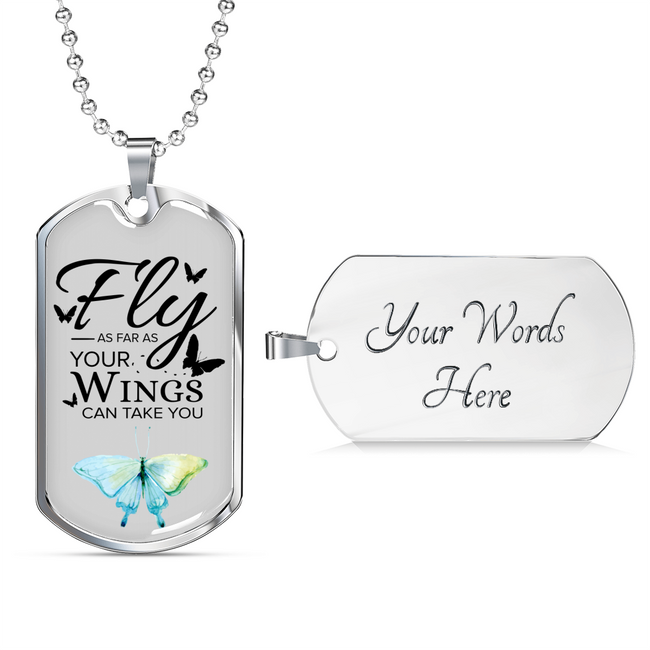 Fly As Far As Your Wings Can Take You Necklace Stainless Steel or 18k Gold Dog Tag 24" Chain