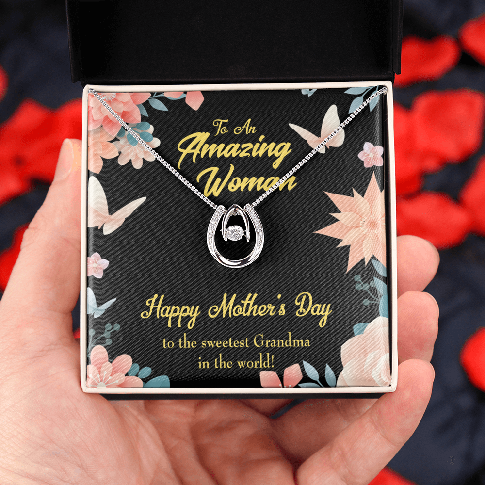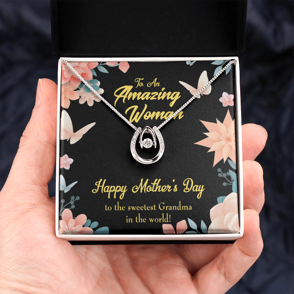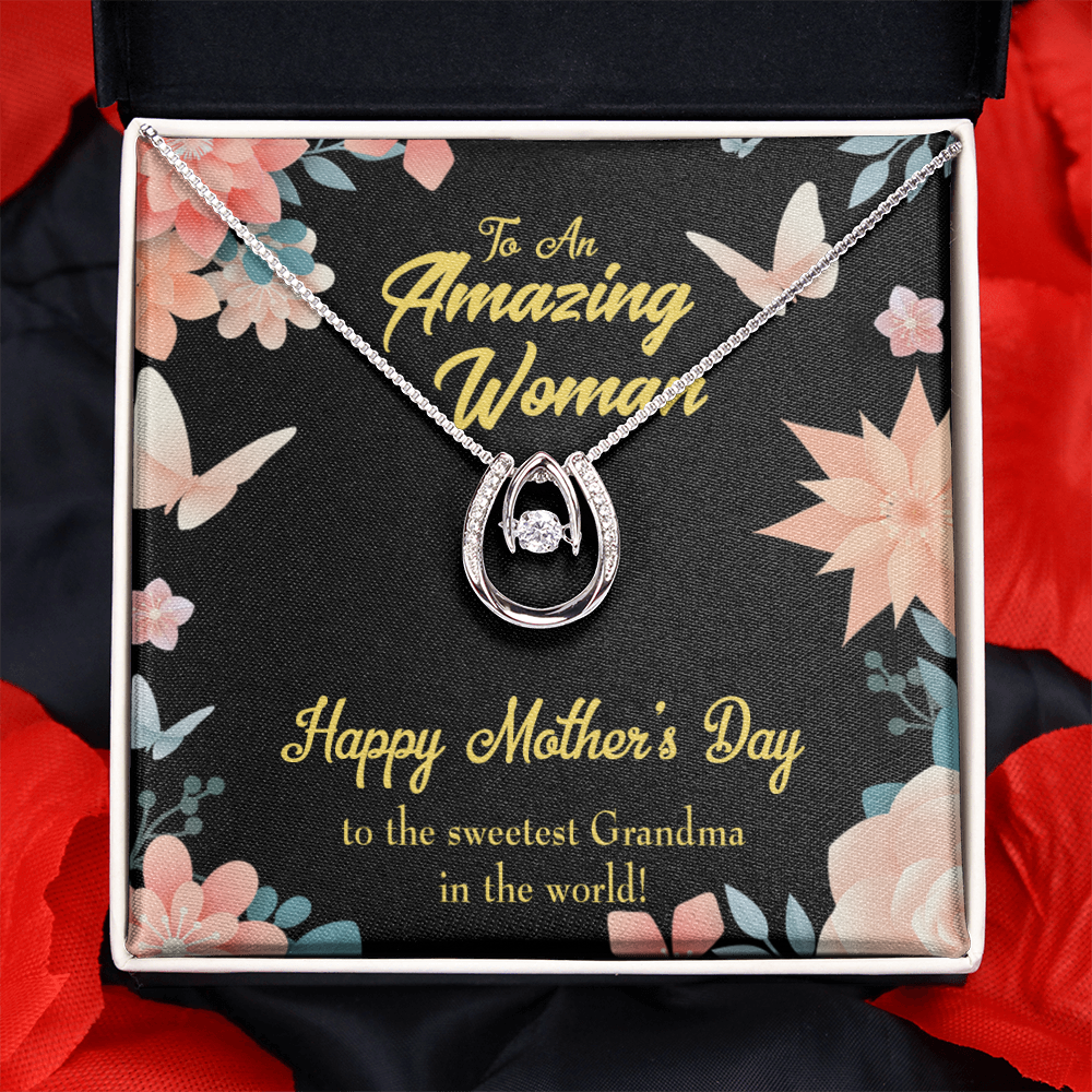 Sweetest Grandma Lucky Horseshoe Necklace Message Card 14k w CZ Crystals