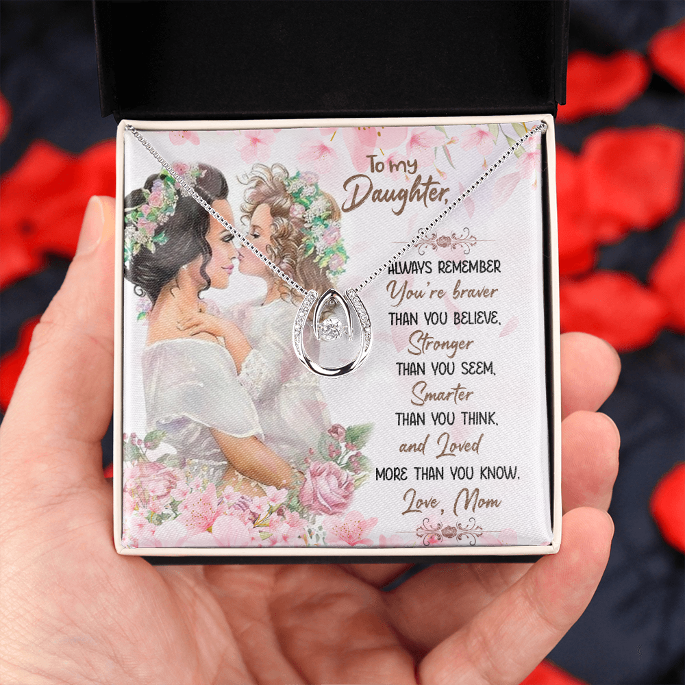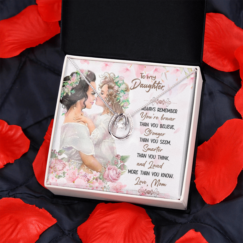 To My Daughter You Are Braver Stronger Smarter Lucky Horseshoe Necklace Message Card 14k w CZ Crystals