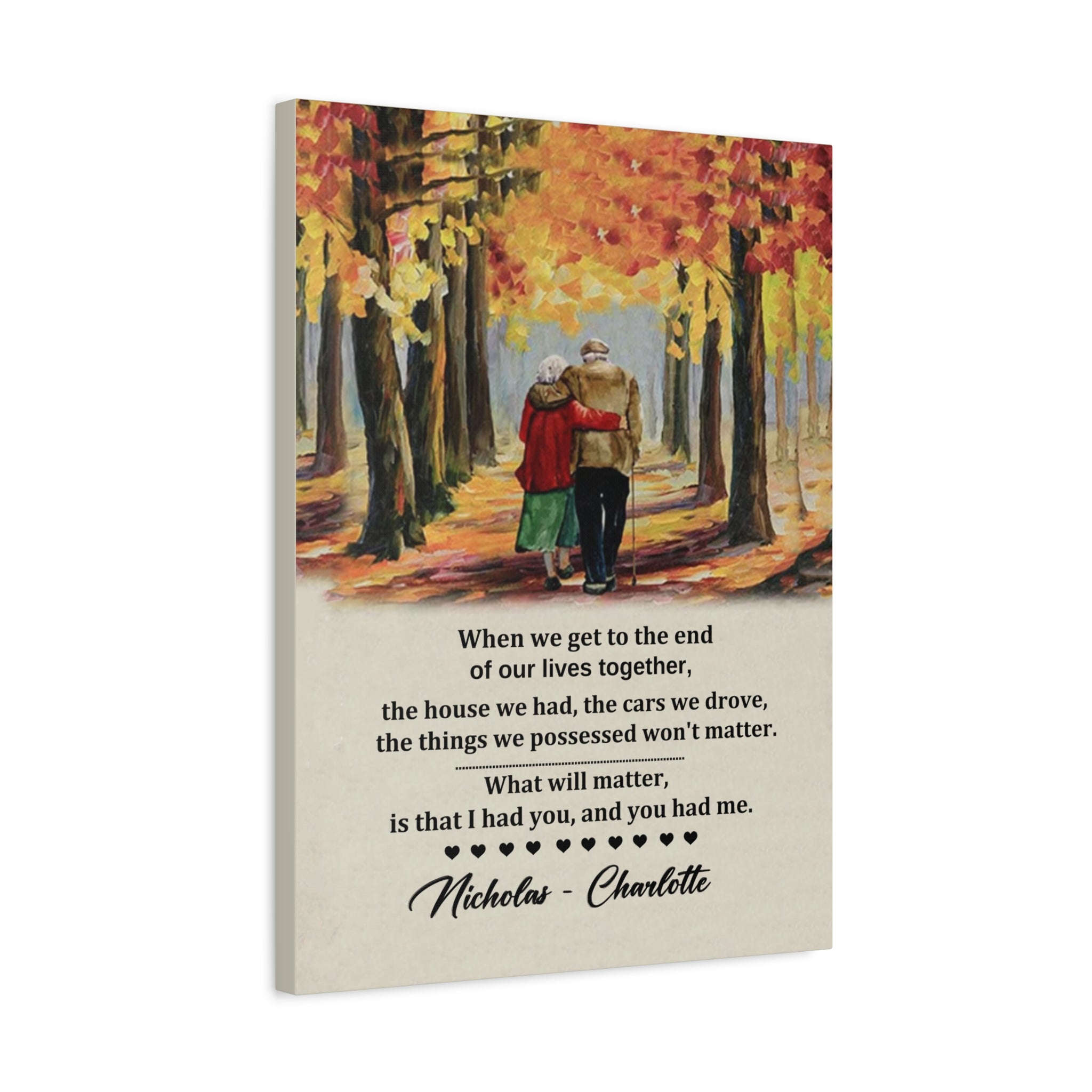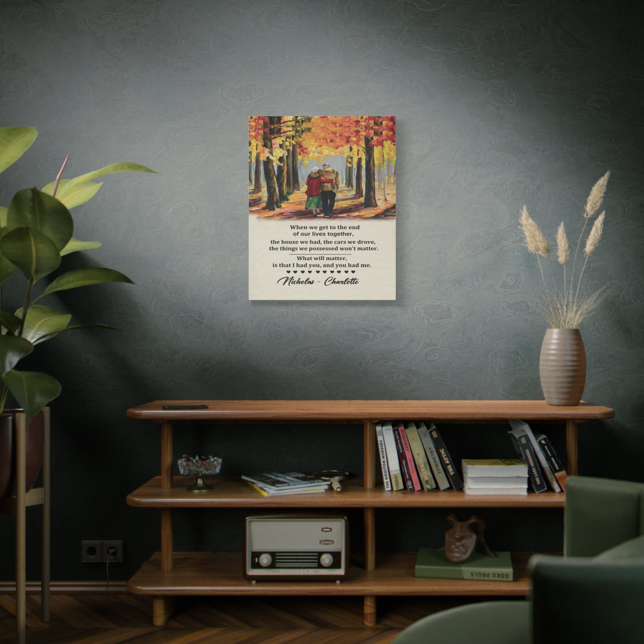 Celebrate your journey of love and togetherness with this beautifully personalized “Our Lives Together” Canvas Wall Art. Featuring a charming illustration of a couple walking hand-in-hand through a forest of autumn leaves, this artwork is the perfect representation of companionship, shared memories, and the beauty of enduring love. Customize it with names and a heartfelt message for a truly one-of-a-kind keepsake.