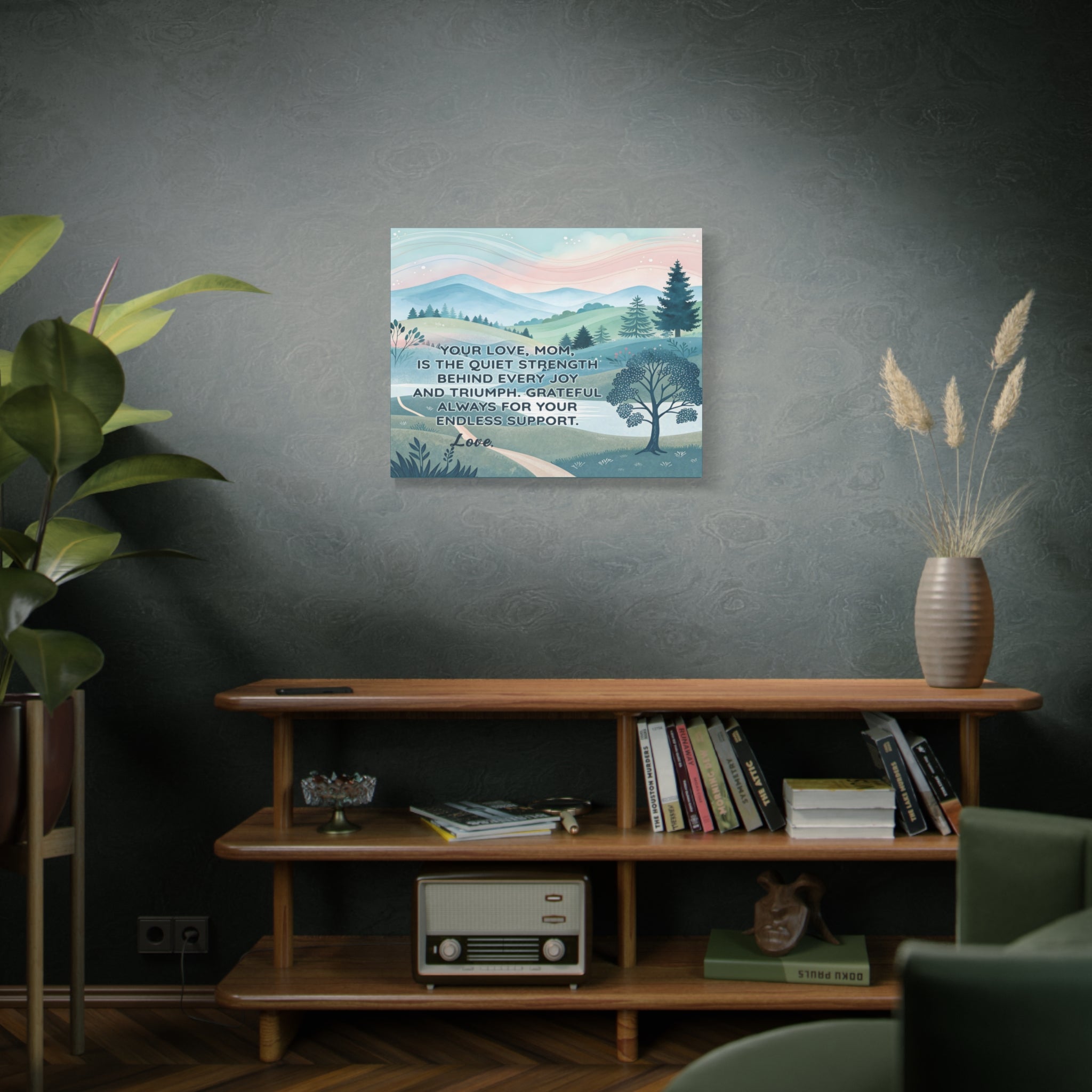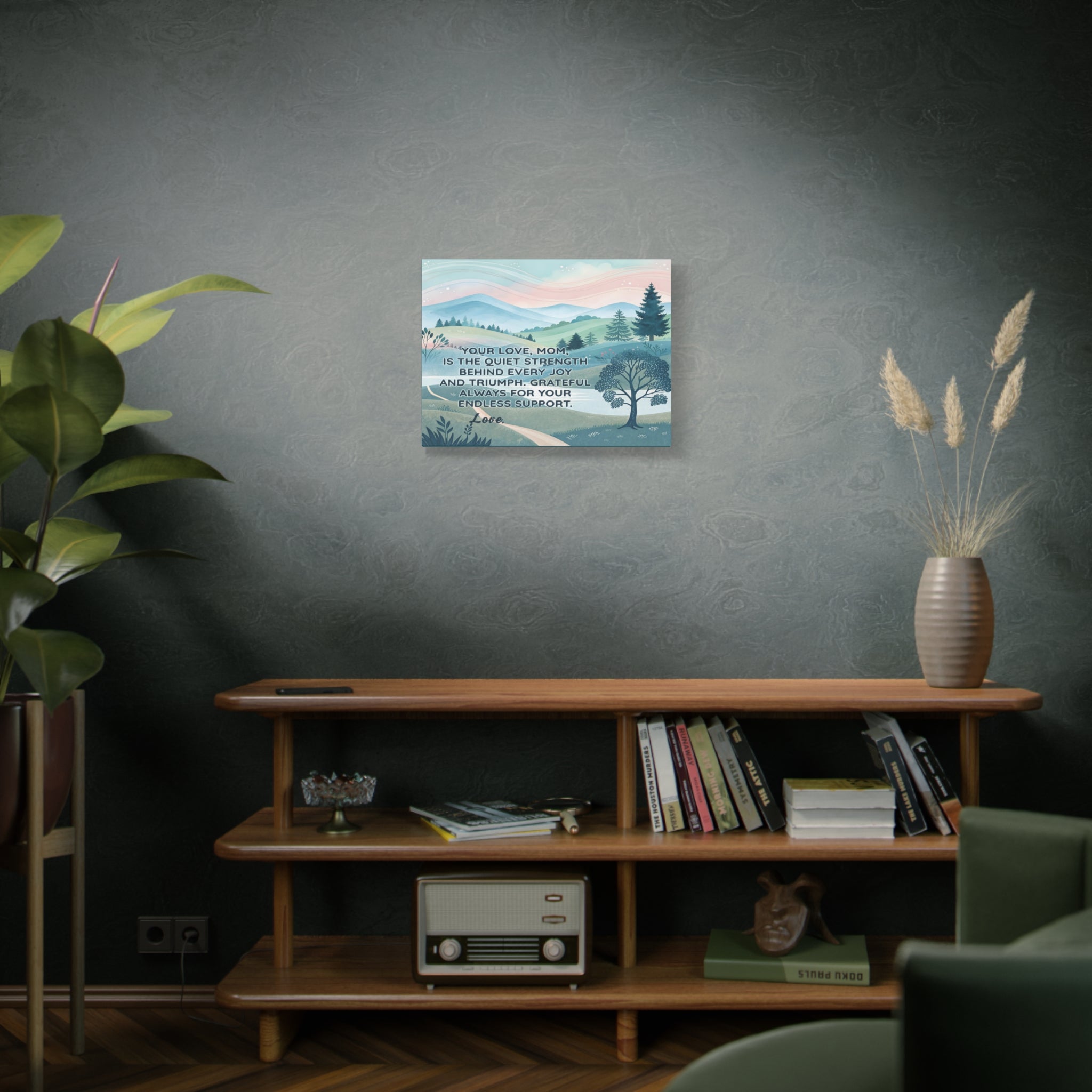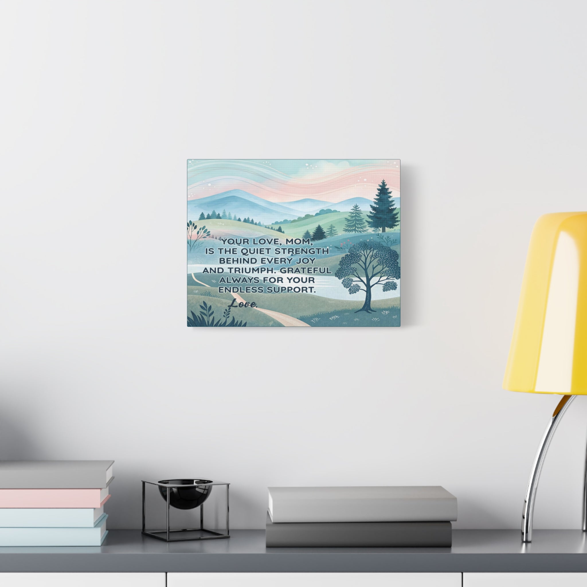 Express heartfelt gratitude with the "To Mom – Endless Support" Personalized Canvas Print, a stunning piece featuring serene pastel mountain landscapes and the touching message: