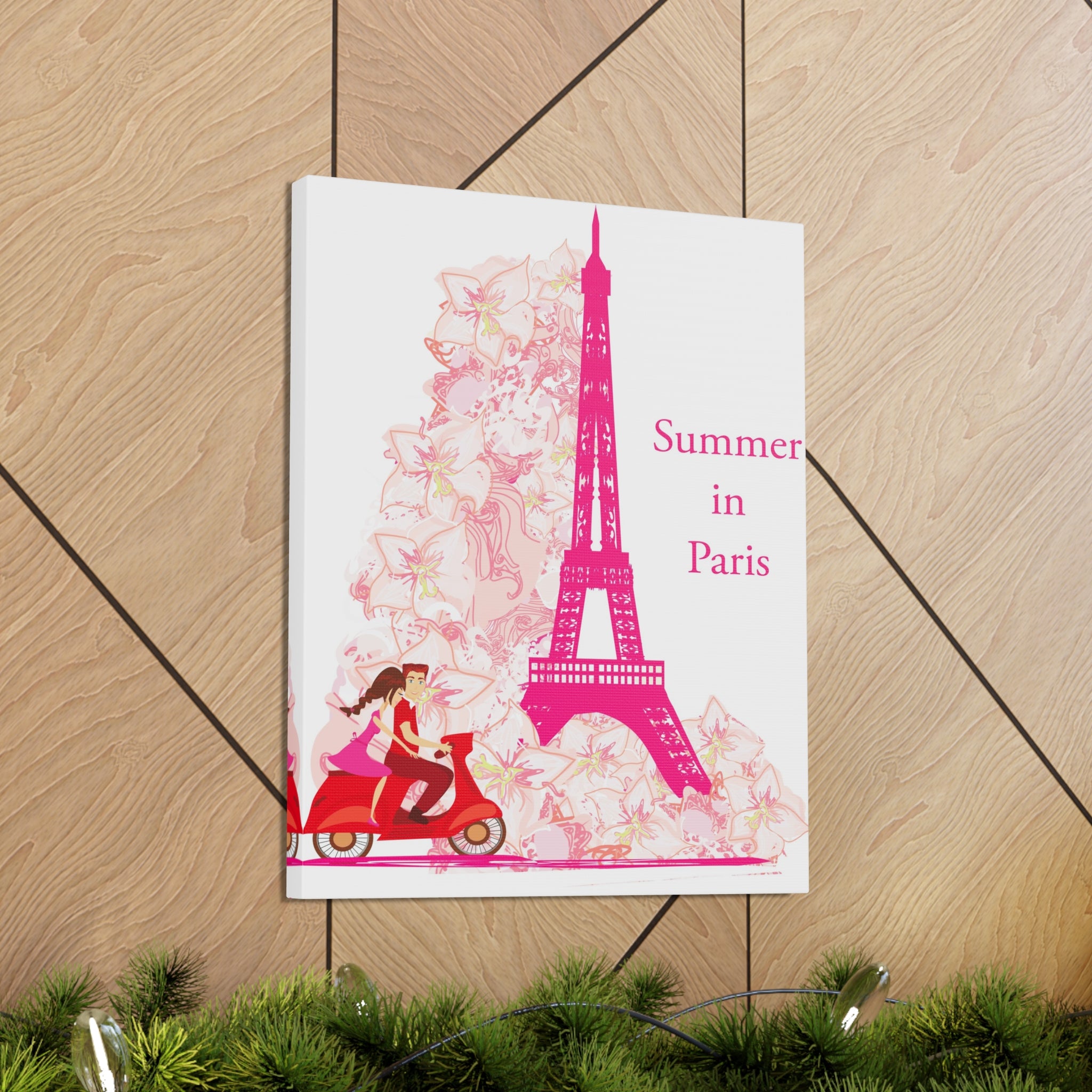 Pink Eiffel Tower Couple On Scooter Paris France Canvas Artwork Breathtaking French City for Home Decor Ready to Hang