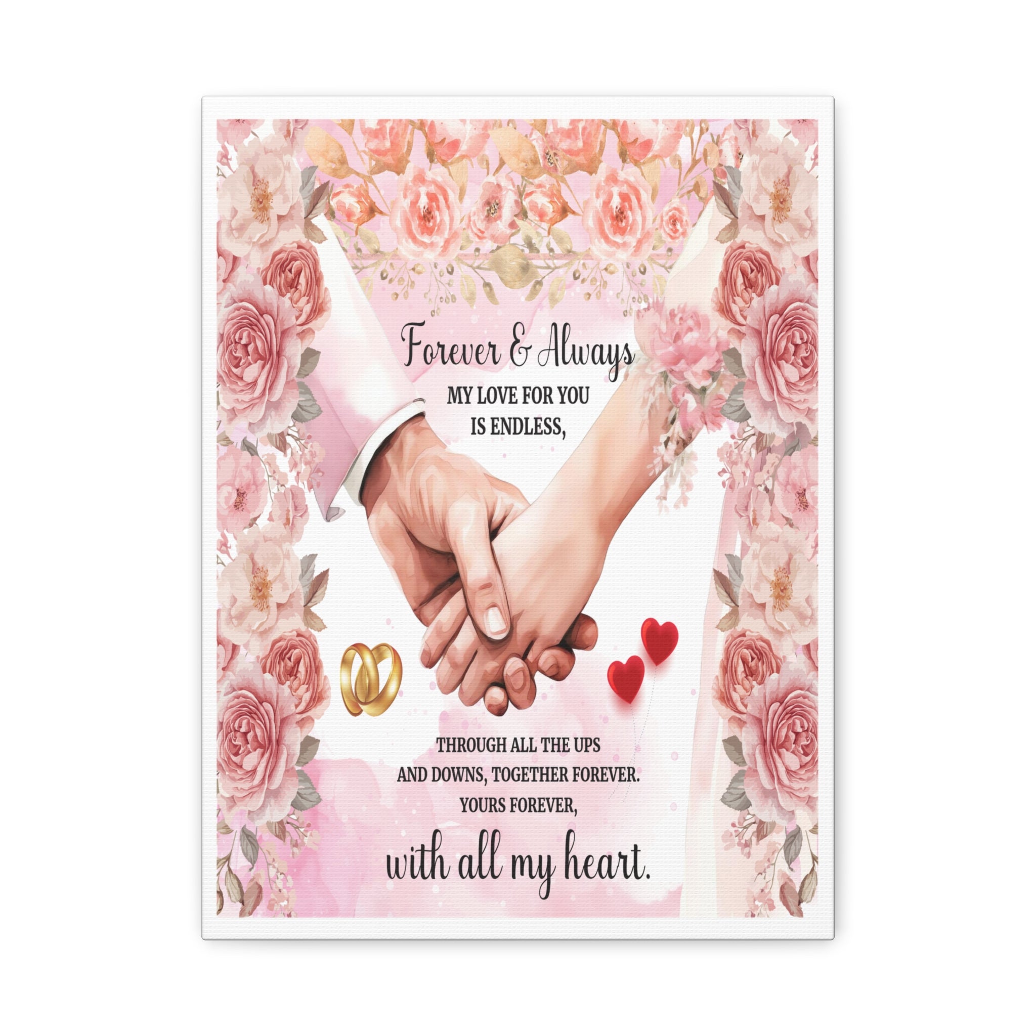 Celebrate the beauty of enduring love with the "Forever & Always" floral canvas wall art. This elegant piece features an intertwined hands motif surrounded by blooming roses and delicate greenery, symbolizing commitment and togetherness. Perfect as a wedding or anniversary gift, this artwork encapsulates a heartfelt promise of love and loyalty, making it a meaningful addition to any home decor.