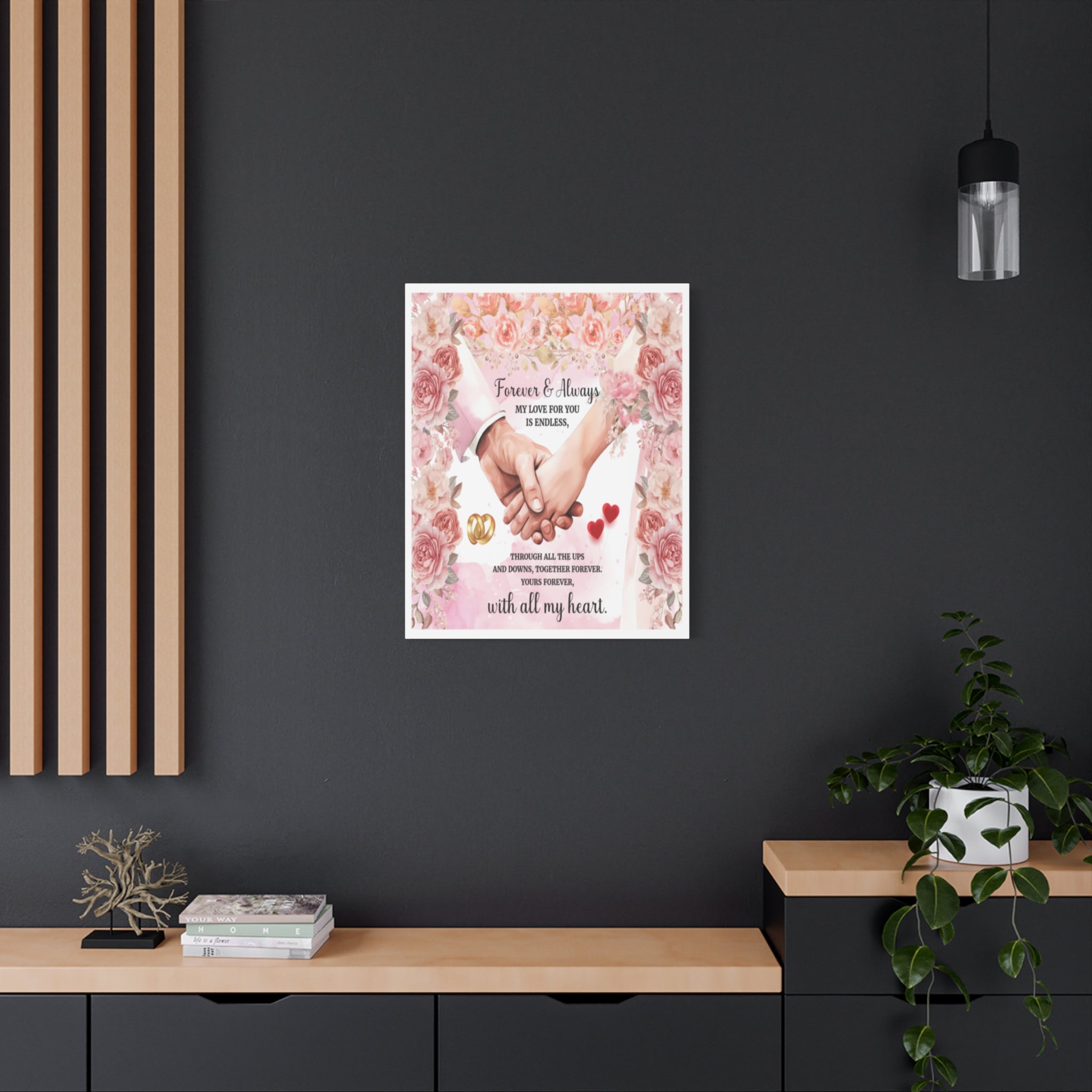 This "Forever & Always" canvas is more than just wall art; it’s a declaration of love that lasts a lifetime. The tender imagery of holding hands, surrounded by roses, symbolizes the strength of commitment and the beauty of togetherness. A perfect gift for weddings, anniversaries, or simply to remind your loved one of your devotion, this piece adds warmth and romance to any space.
