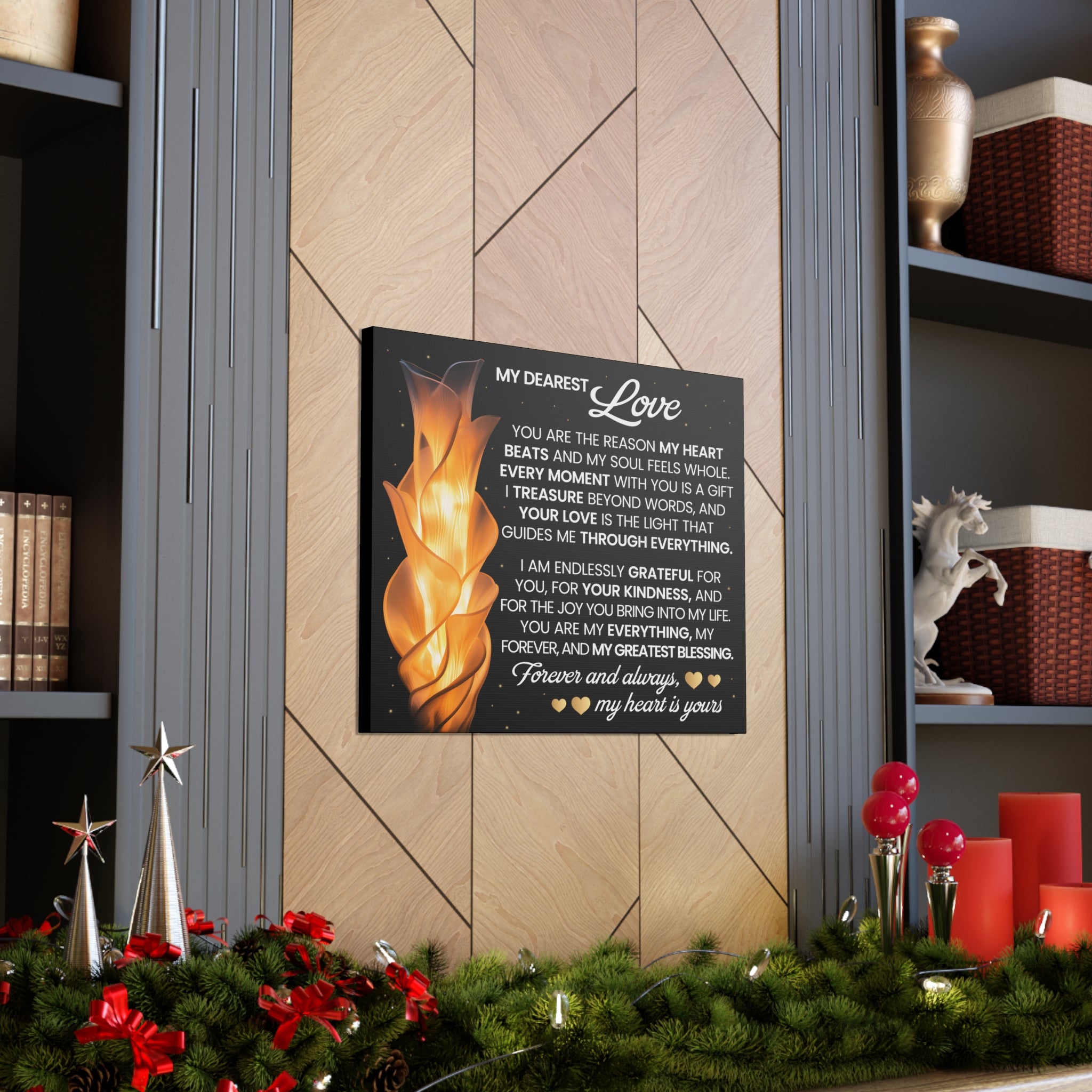 Express your deepest love and devotion with this My Dearest Love Romantic Flame Canvas, a heartfelt tribute to the passion, gratitude, and joy shared in a meaningful relationship. This beautifully crafted artwork features a stunning flame design, symbolizing the warmth and light of love, paired with a heartfelt message that captures the essence of true connection.