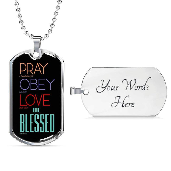 Christian Pray Obey Love Be Blessed Necklace Stainless Steel or 18k Gold Dog Tag 24" Chain
