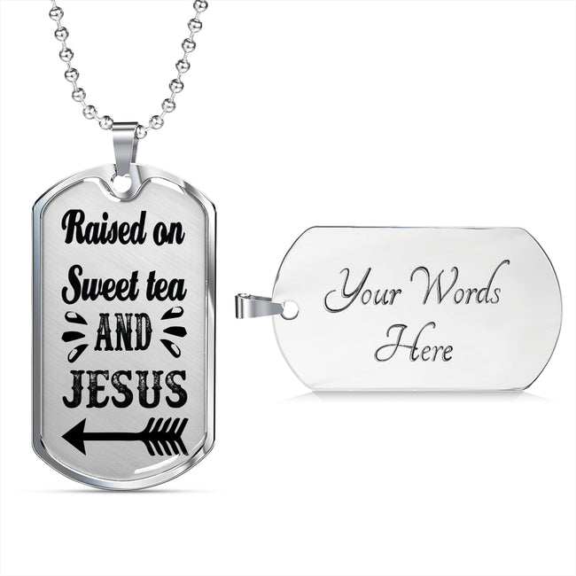 Raised On Sweet Tea And Jesus Necklace Christian Dog Tag Stainless Steel or 18k Gold 24" Ball Chain