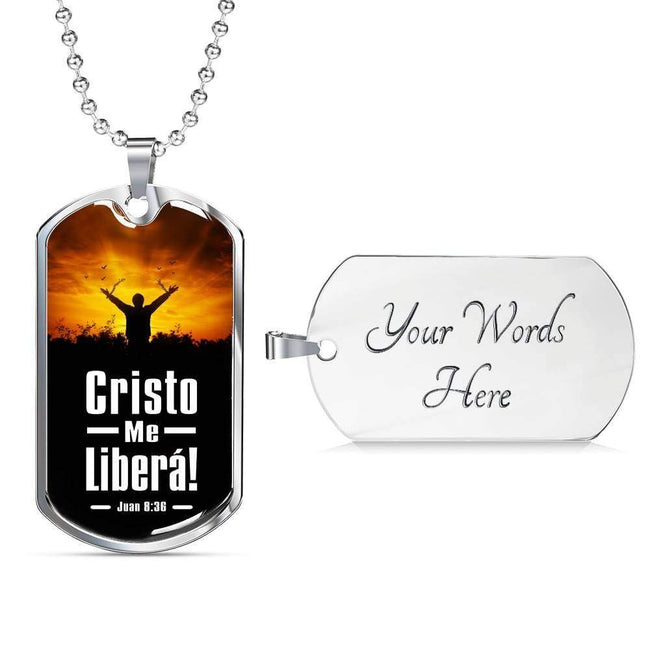 Christ Free Me In Spanish Religious Necklace Juan 8:36 Necklace Stainless Steel or 18k Gold Dog Tag 24" Chain