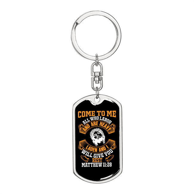 Come To Me Matthew 11:28 Stainless Steel or 18k Gold Premium Swivel Dog Tag Keychain
