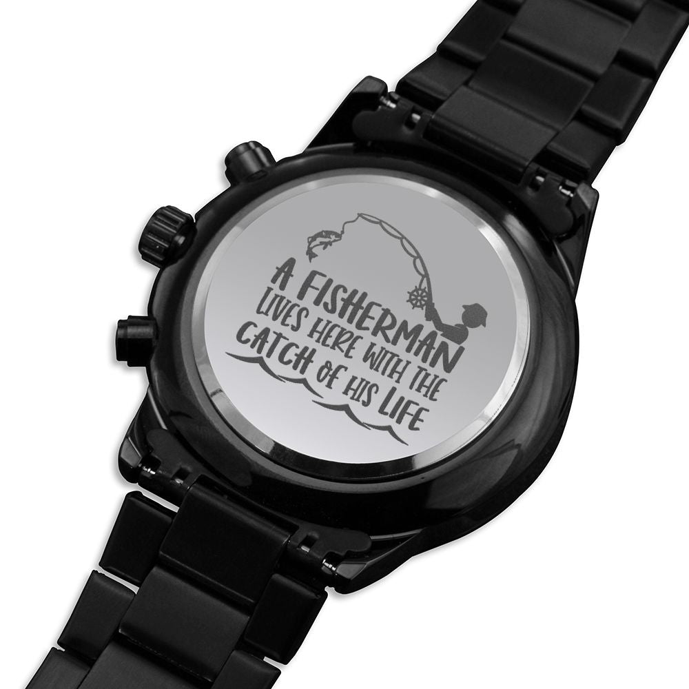 Fisherman Lives Here Engraved Multifunction Analog Stainless Steel Chronograph Men's Watch W Copper Dial
