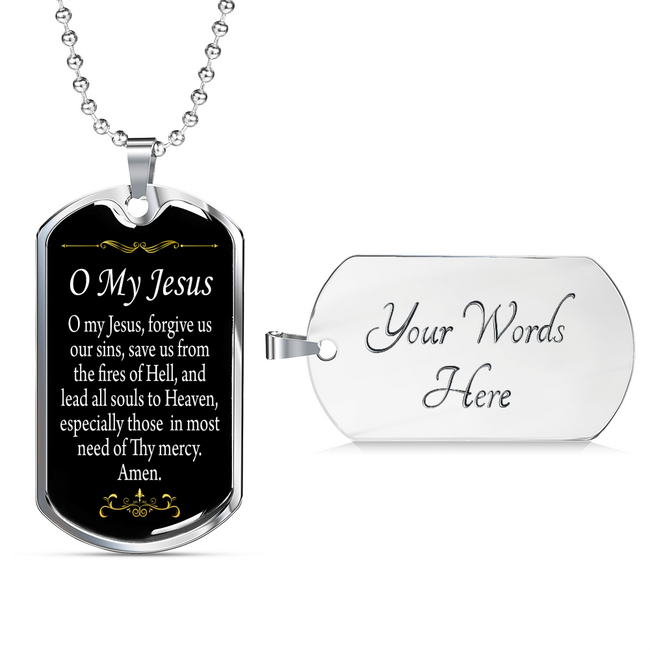 O' My Jesus Catholic Prayer Dog Tag Stainless Steel or 18k Gold 24" Chain