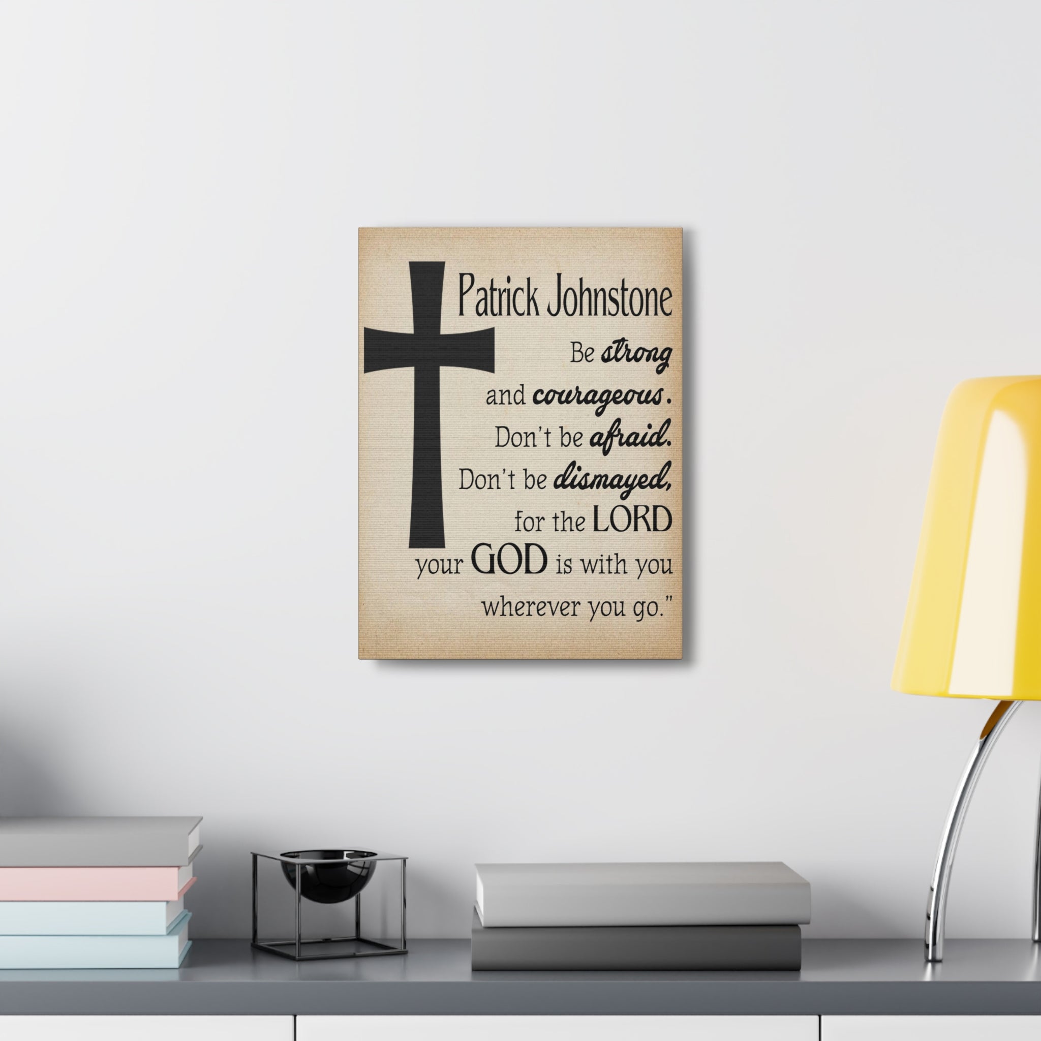 Find strength and encouragement with this Personalized Joshua 1:9 Canvas, a powerful reminder that God is always with you. Featuring the scripture "Be strong and courageous. Do not be afraid; do not be dismayed, for the Lord your God is with you wherever you go.", this artwork serves as a daily affirmation of faith, courage, and divine guidance.