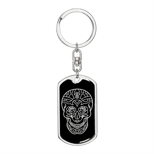 Calavera Mexican Sugar Skull 20 Stainless Steel or 18k Gold Premium Swivel Dog Tag Keychain